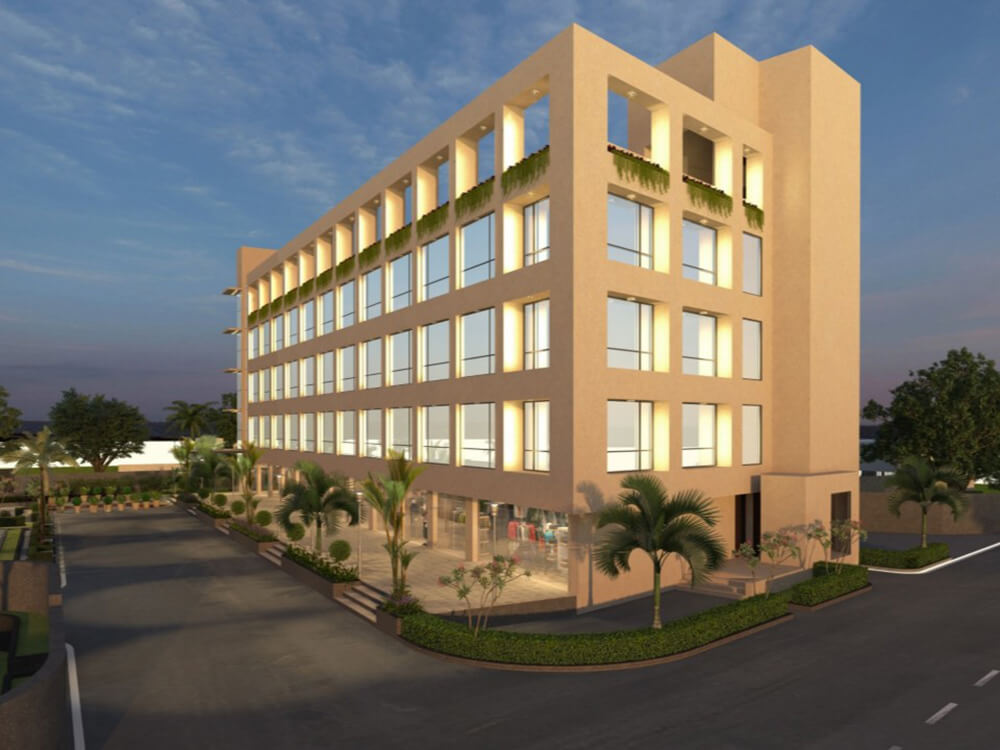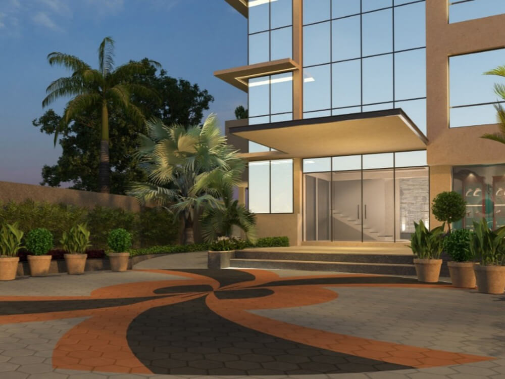 The golden shine hotel welcomes you through a beautiful landscape that leads to the main entrance door.