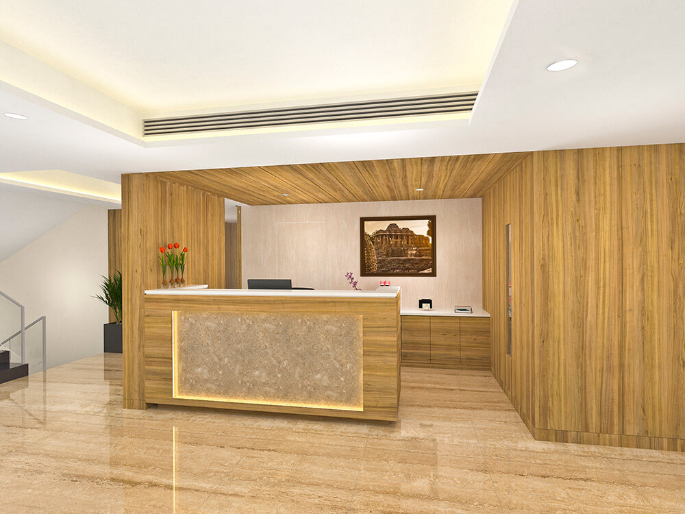 The waiting area is a comfortable sitting space in elegant colours to create a sophisticated ambience